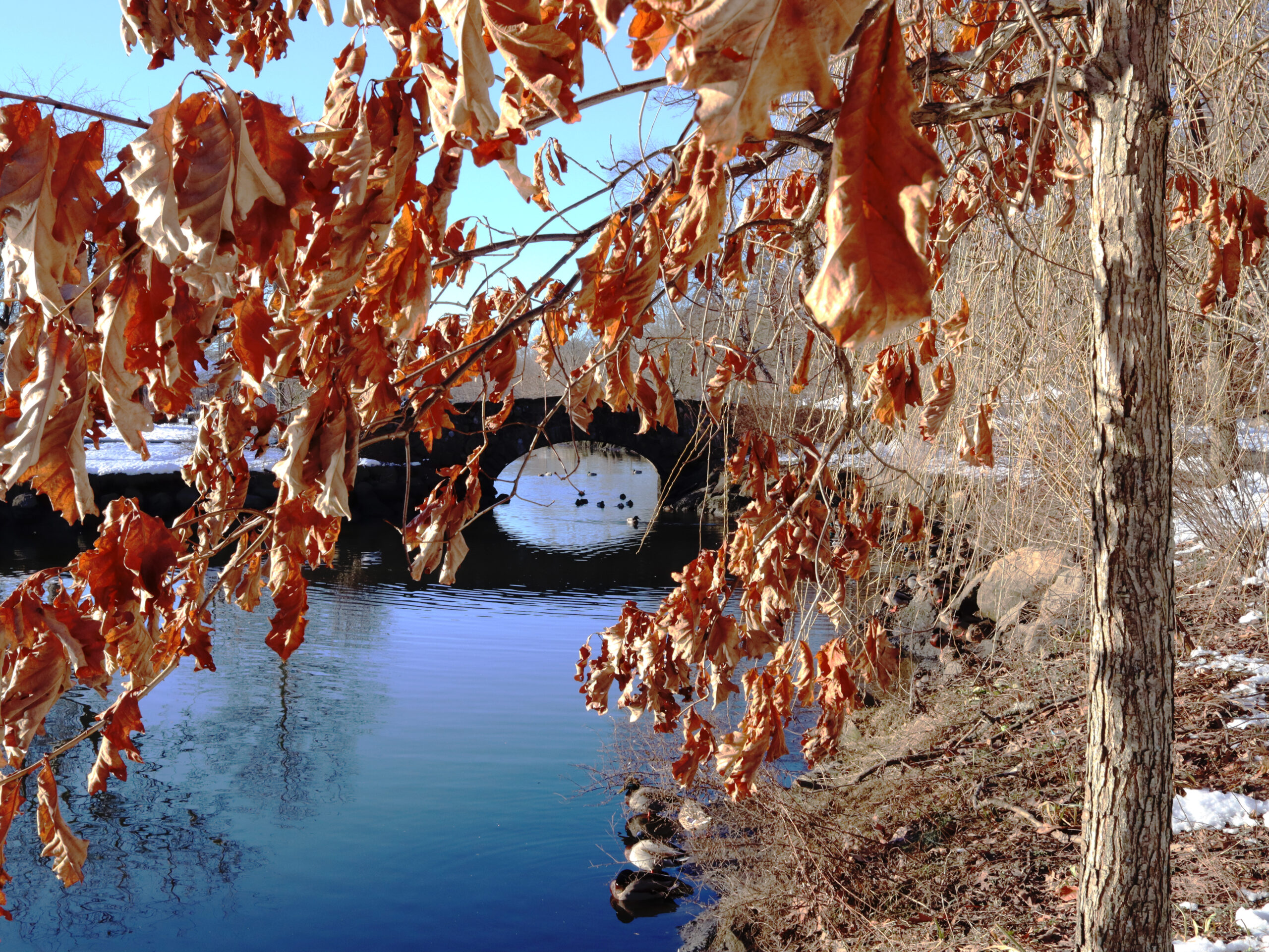The bridge is always ready to help people cross to the other side; and protect the habitat of the geese. But the surrounding trees are ready to protect the pond with the leaves patterns, repetition merging with curves, straight lines, verticals, and diagonals from the branches of the trees.