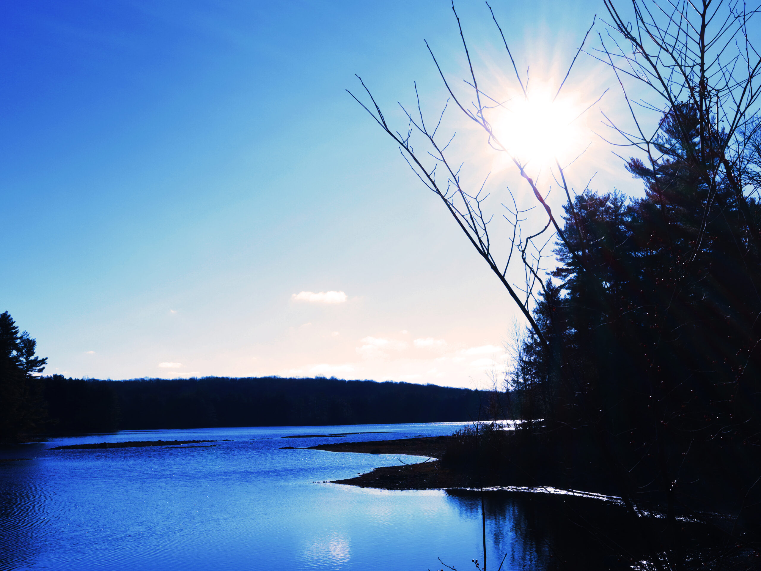 The contrast between the blue tones of the sky and the lake is persistent. Prevailing the foreground of the lake with its black tones, treasuring its ecosystem, precious to man. Where the repetition of trees and branches claim positive and negative space, embellishing its composition.
