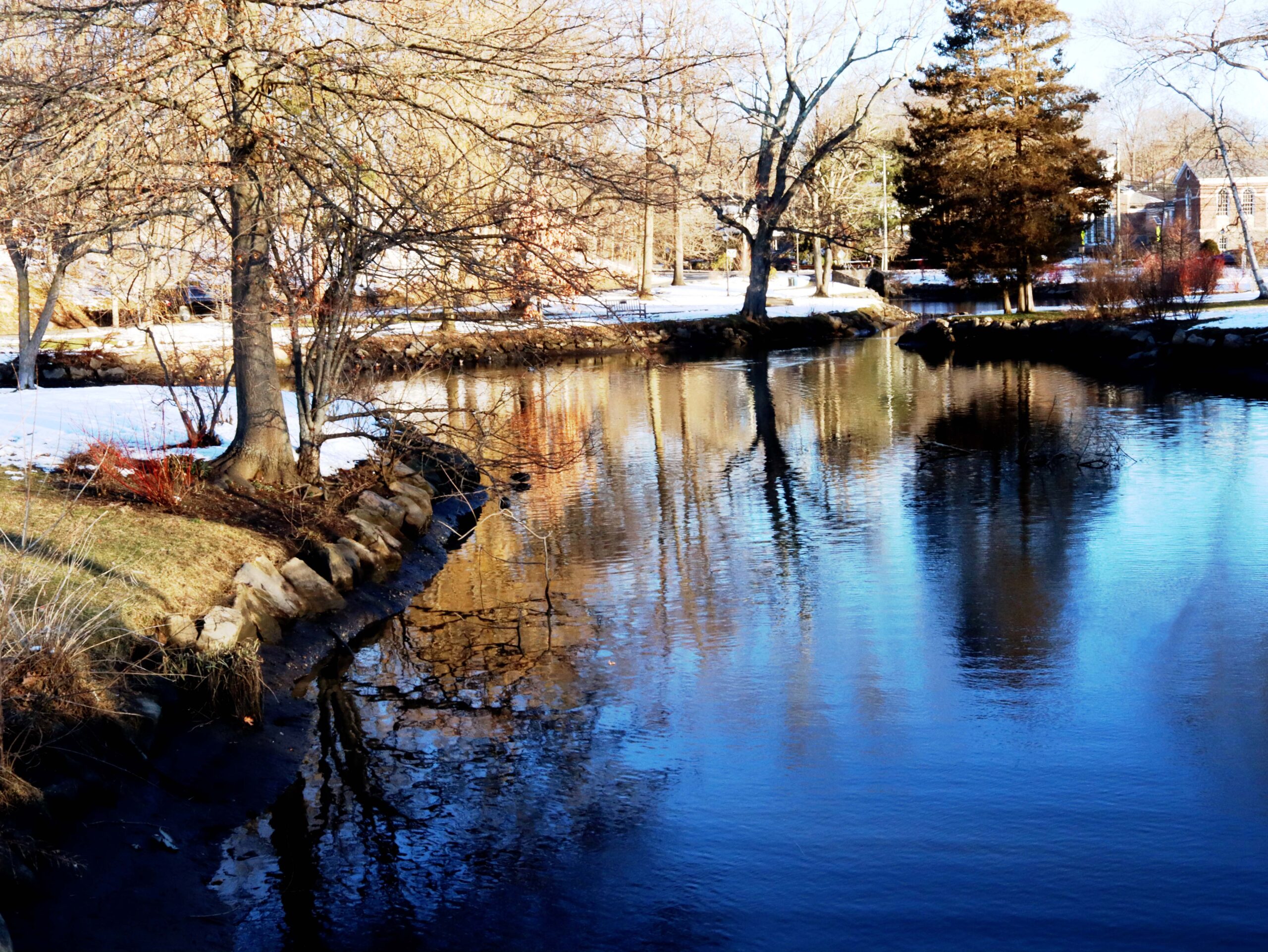 The movement and rhythm of the riverbed, protected by small man-made walls, protects the river's most precious treasure: water. The branches, adorned during the winter months, hold irregular shapes of frozen water droplets, contrasting and merging with the icy waters of the river.